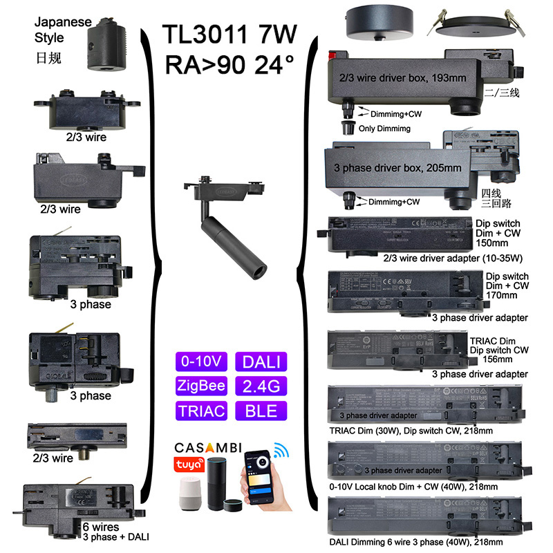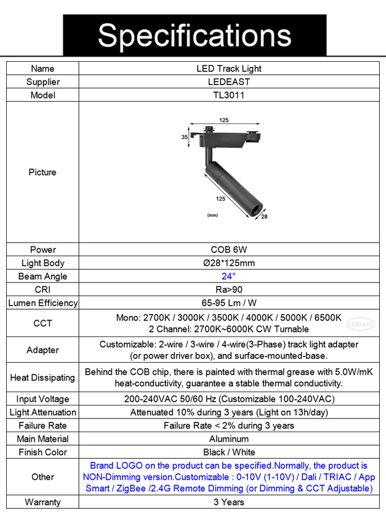 Model: TL3011 Input Voltage: AC220V, Customizable AC100-240V CCT: 2700K / 3000K / 3500K / 4000K / 5000K / 6500K / 20000K / CW2700-6000K Beam Angle: 24° Size: 28*125mm Lumens: 65-95 lm / w Heat-dissipating: High Quality Aluminum Finish Color: Black / Whitel Customizable: 0-10V (1-10V) / Dali / TRIAC / App Smart / ZigBee /2.4G Remote Dimming (or Dimming & CCT Adjustable)